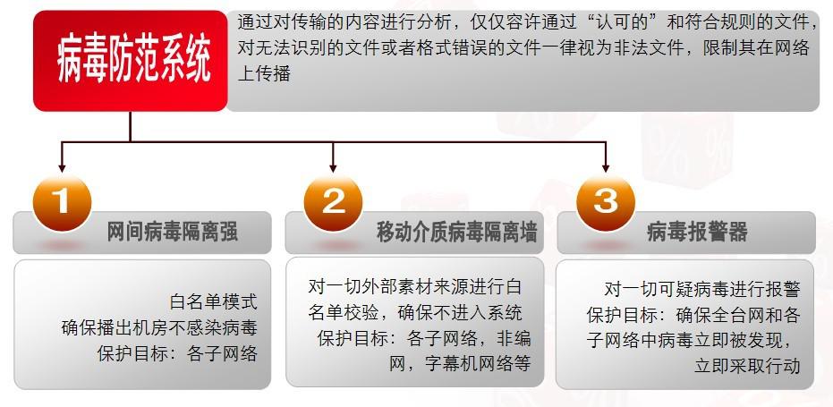 目前,大家采用常規(guī)的技術手段來應對,如加防火墻、封閉USB接口、軟件殺毒等措施,不僅費時費力,而且事倍功半,防不勝防。針對廣電數字制播系統(tǒng)的結構和數據特點,能夠安全、有效、放心地實現(xiàn)病毒隔離的防范系統(tǒng),深受業(yè)內人士期盼。
